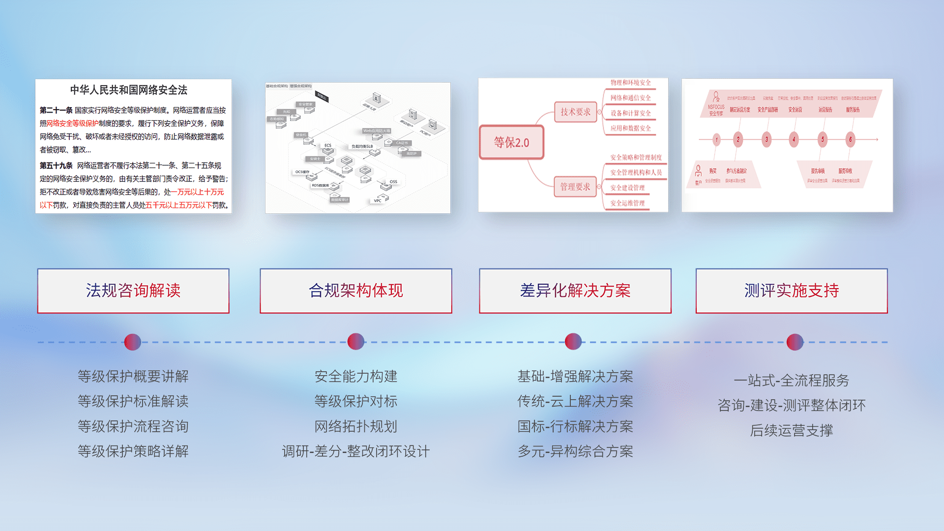 通过专业的法律咨询解读、、、合规架构体现、、差异化解决方案、、、测试实施支持等服务,,,,为客户量身打造等保合规体系。。